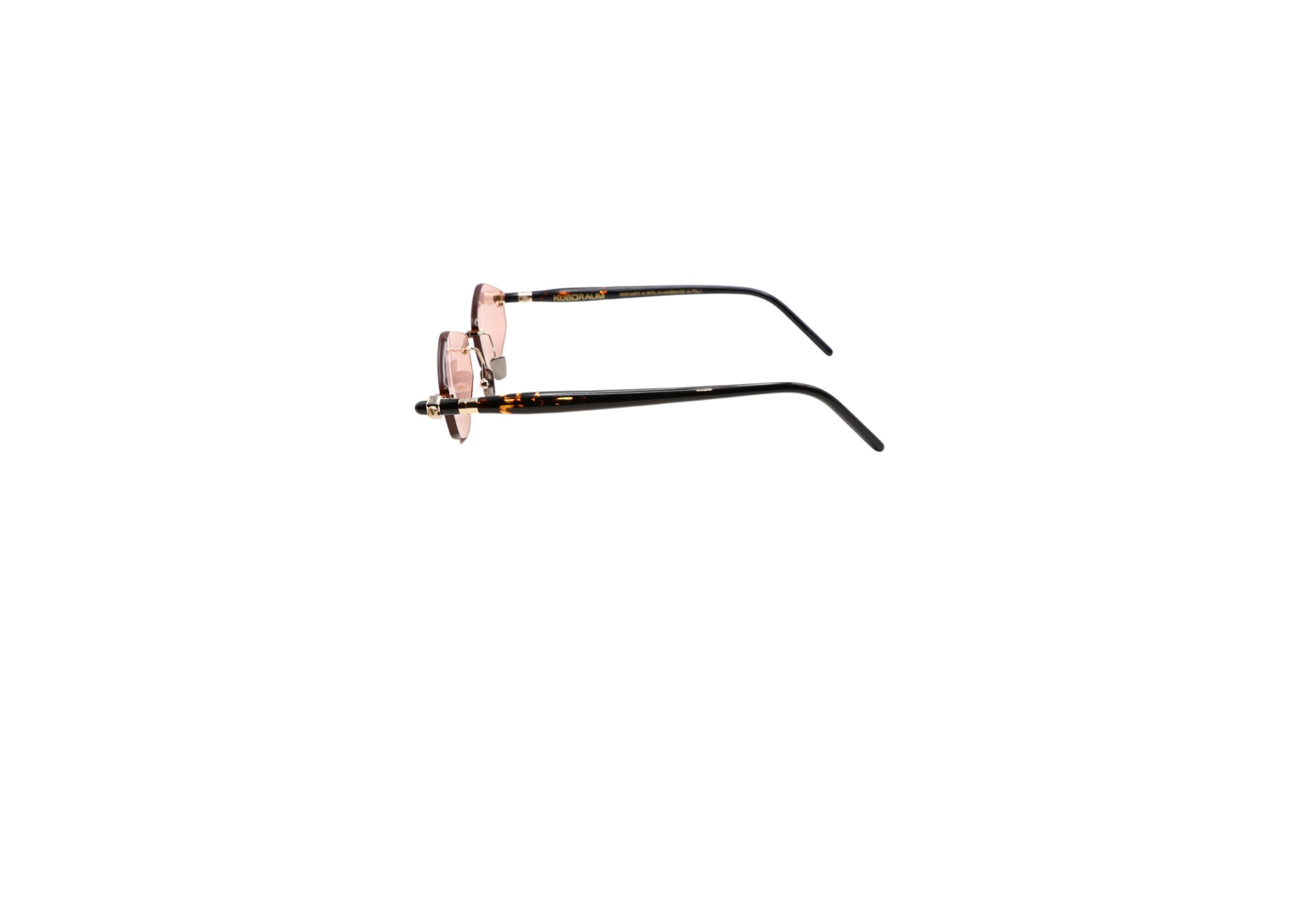 Rombus-shaped lenses are secured in a luminous rimless frame composed by three precious details: two bolt-like hinges on either side and multifaceted bridge.
